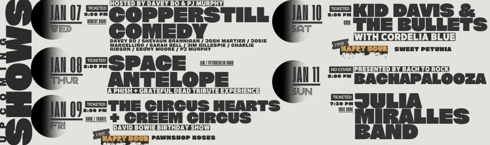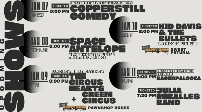 Sat Jan 10 Rock Kid Davis & the Bullets (Album Release Show) with Cordelia Blue Doors: 7:00 PM | Show: 8:00 PM Ages 21+ TICKETS