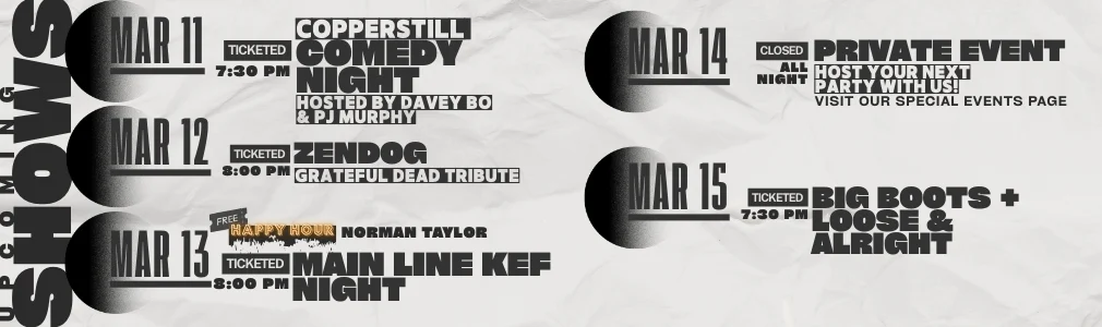 Tue Mar 17 Irish / Folk St. Paddy's Day with Mick's Company Doors: 4:00 PM | Show: 5:30 PM Ages 21+ TICKETS