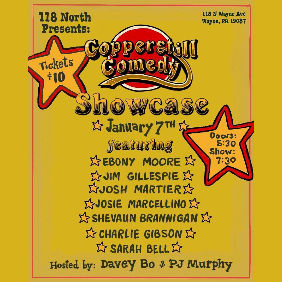 Wed Jan 07 118 North Comedy Night Copperstill Comedy hosted by Davey Bo & PJ Murphy with Davey Bo , Shevaun Brannigan, Josh Martier, Josie Marcellino, Sarah Bell, Jim Gillespie, Charlie Gibson, Ebony Moore, PJ Murphy Doors: 5:30 PM | Show: 7:30 PM Ages 21+ TICKETS